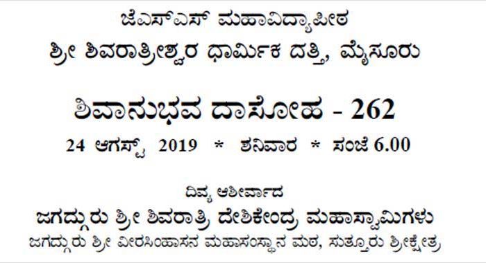 Program: Shivanubhava Dasoha – 262 Date: August 24, 2019, Saturday Time: 6.00 pm Venue: No. 65, Opp: Allamaprabhu Park, JSS [...]