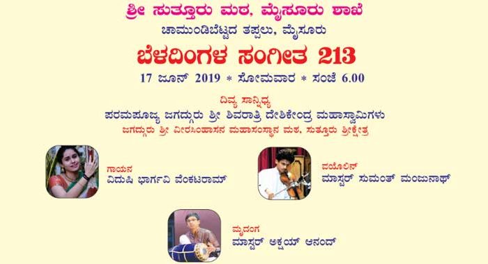 Programme: Beladingala Sangeetha-213 (Moonlight Music) Date: June 17, 2019, Monday Time: 6.00 PM Venue:Sri Suttur Math, Chamundi [...]