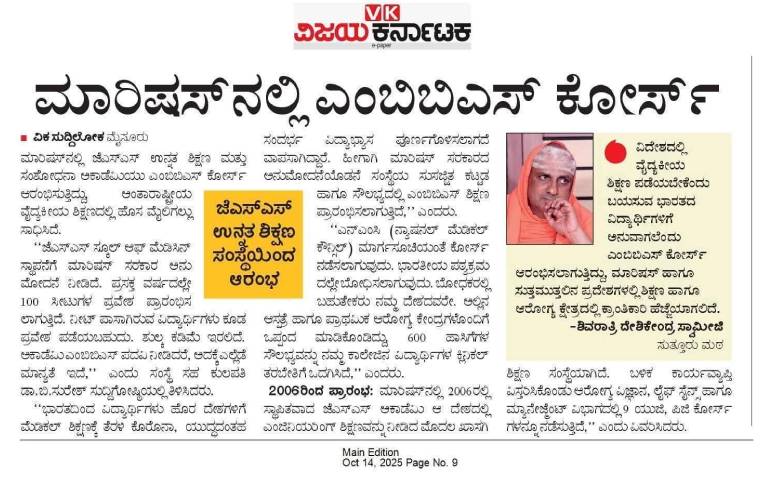 JSS AHER to commence MBBS course in Mauritius View Larger Image admin2025-10-18T09:51:19+00:00 Share This Story, Choose Your Platform! FacebookTwitterLinkedInRedditWhatsappGoogle+TumblrPinterestVkEmail